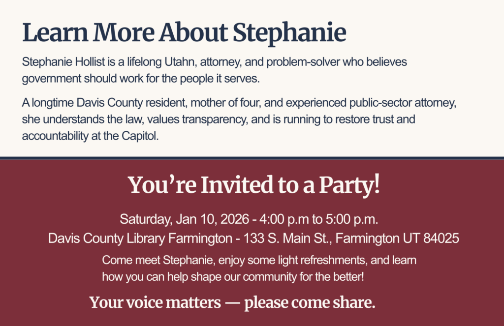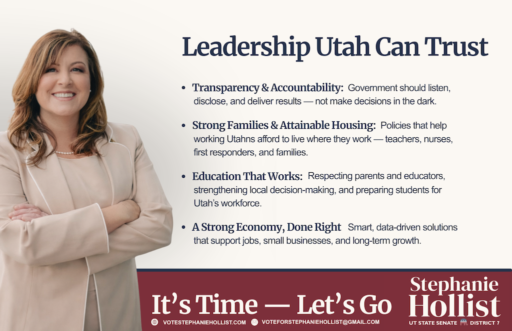 Stephanie Hollist is a lifelong Utahn, an attorney, and a problem-solver who believes Utah’s government should work for the people it serves — not for entrenched power.